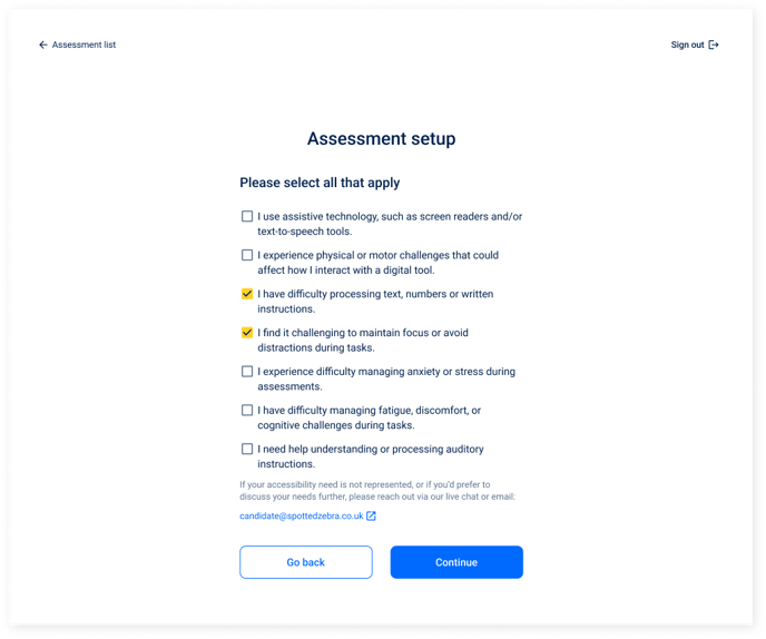 At the beginning of your assessment, we’ll ask if you need any support to complete it comfortably.